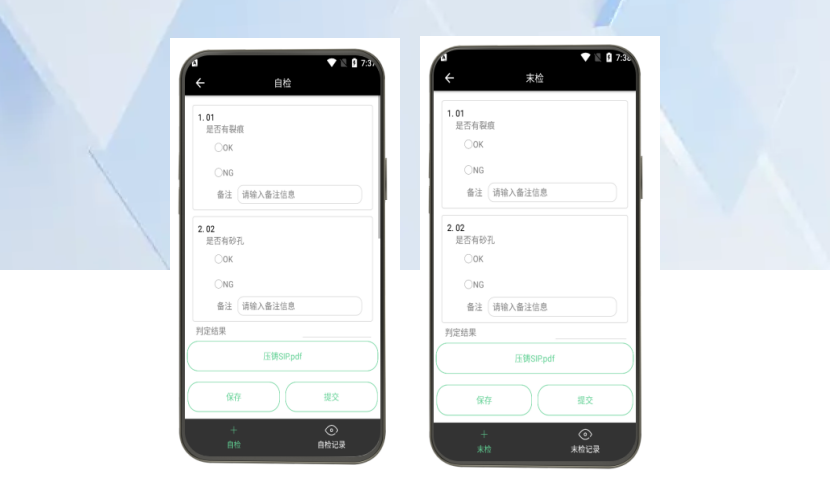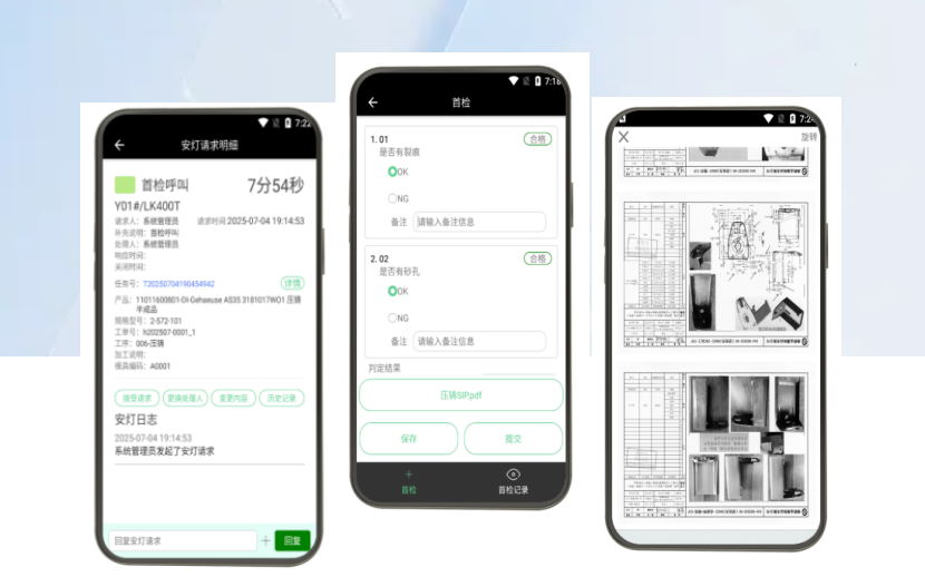 當(dāng)任務(wù)首檢觸發(fā)后,安燈管理系統(tǒng)會自動推送首檢任務(wù)至品質(zhì)人員終端。品質(zhì)人員接收任務(wù)后,前往指定機(jī)臺執(zhí)行首檢,可通過終端實時查看產(chǎn)品SIP(標(biāo)準(zhǔn)檢驗程序),并支持拍照上傳首檢結(jié)果,最終完成首檢確認(rèn)流程。