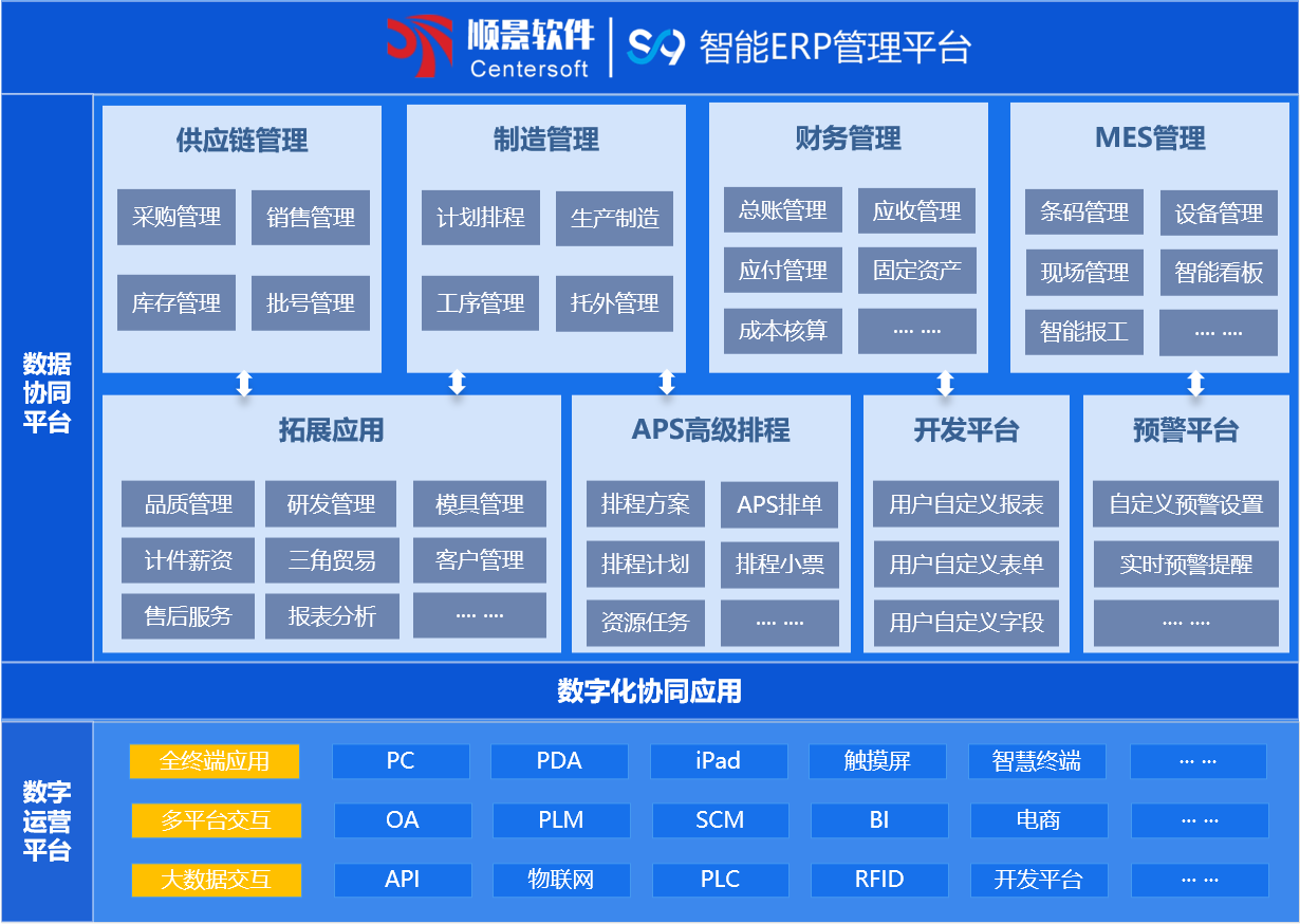 順景S9 ERP系統,以制造為核心,將制造企業最核心的生產管理需求與供應鏈管理、財務管理相結合完美結合,打造以生產計劃為核心的業務流+財務流一體化管理體系,提供了對企業信息化管理和數字化管理的核心模塊:供應鏈管理、MRPII管理、生產制造管理、委外管理、財務管理、成本核算管理、人事薪資管理,品質管理,條碼管理、智能看板,在這幾大核心模塊的支撐下,建立起企業數字化運營管理體系,及現代化高效協同工作的平臺。