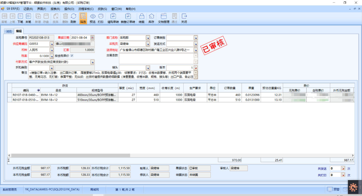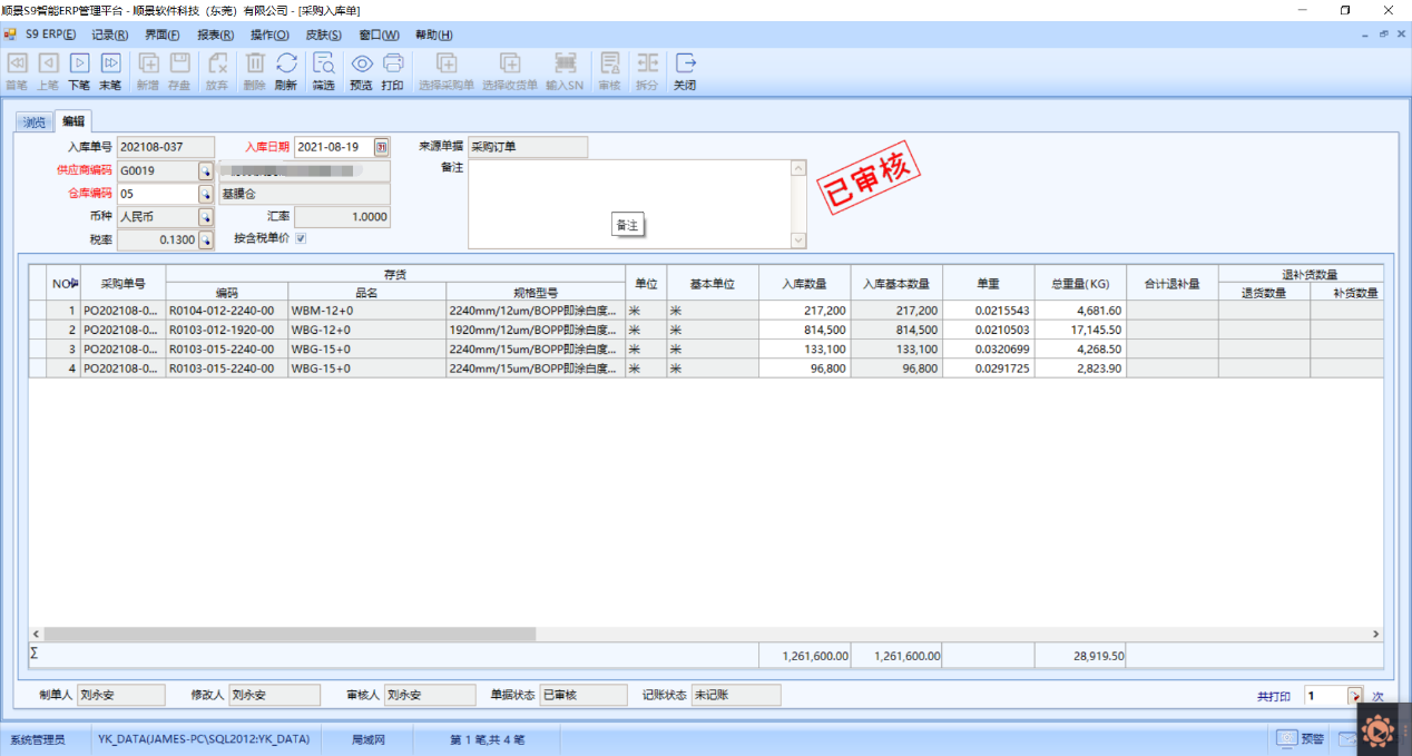 采購在接收到PMC請購需求時,可以把對應(yīng)客戶要求,關(guān)聯(lián)至采購訂單,并且采購明細(xì)有厚度、寬度、收卷長度、生產(chǎn)要求欄位指定,方便采購與計劃以及銷售的信息協(xié)同,倉庫入庫時多單位計量,系統(tǒng)不僅記錄基本采購單位,還顯示物料單重以及入庫總重量。