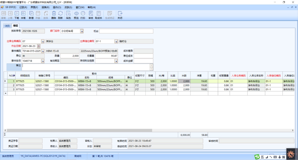 分切車間通過掃碼的方式完成分切單據(jù)的錄入,PMC首先會根據(jù)明天要做的銷售訂單產(chǎn)品,打印銷售訂單,并附帶銷售訂單的訂單條碼,下發(fā)給分切車間機(jī)臺的機(jī)長,機(jī)長通過拆卸單界面用掃碼槍掃描條碼的方式進(jìn)行涂布母卷的分切。首先掃描涂布母卷標(biāo)簽上的料號二維碼,再掃描標(biāo)簽上的批號二維碼,系統(tǒng)會自動匹配涂布母卷的信息,自動帶出該母卷的倉庫儲位及米數(shù)等信息。成品分切后,機(jī)長會在拆卸單子表訂單條碼欄位掃描訂單條碼,確定分切的是哪張銷售訂單的產(chǎn)品,掃描訂單條碼后,系統(tǒng)會自動匹配銷售訂單的信息,并自動生成成品的批次號,機(jī)長每分切完一卷都會修改填寫該卷膜的實(shí)際重量及米數(shù),下卷膜分切完后會重復(fù)此操作,分切完后也會貼上成品膜標(biāo)簽。